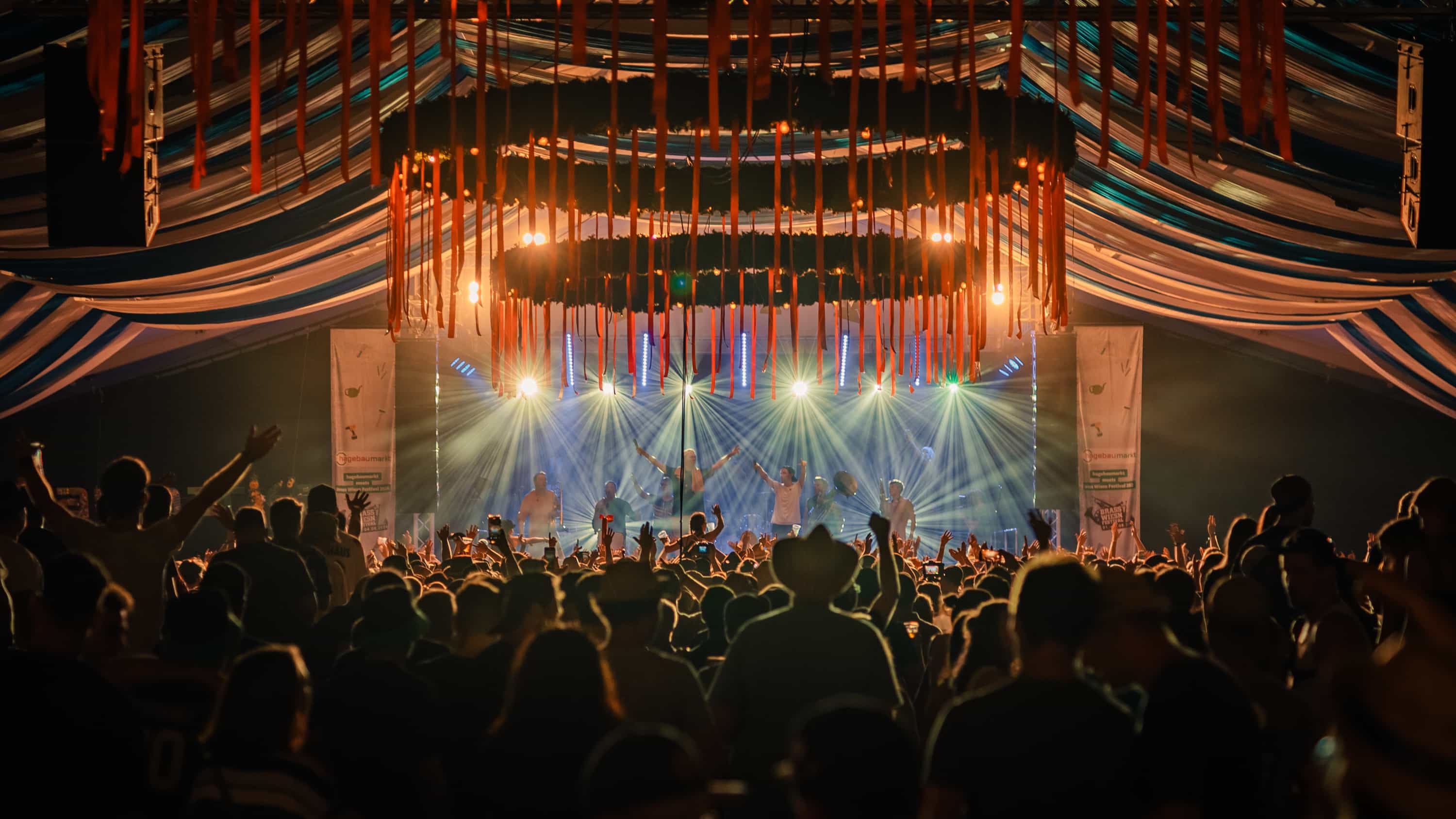 Die Hauptbühne des Brass Wiesn Festival ist das Herzstück des Festivals und Treffpunkt für die größten Live-Acts des Wochenendes. Vor der beeindruckenden Open-Air-Kulisse am Echinger See vereint sie traditionelle Blasmusik, modernen Brass-Pop und internationale Sounds zu einem energiegeladenen Festivalerlebnis. Hier stehen die Headliner des Jahres im Rampenlicht – 2026 unter anderem Edmund und Oimara – während auch internationale Acts wie MOS aus Japan zeigen, wie vielfältig Brass-Musik weltweit interpretiert wird. Tagsüber und bis in die Nacht sorgt die Bühne für ausgelassene Festivalstimmung, tanzende Besucher und die einzigartige Mischung aus bayerischer Lebensfreude und moderner Live-Musik.